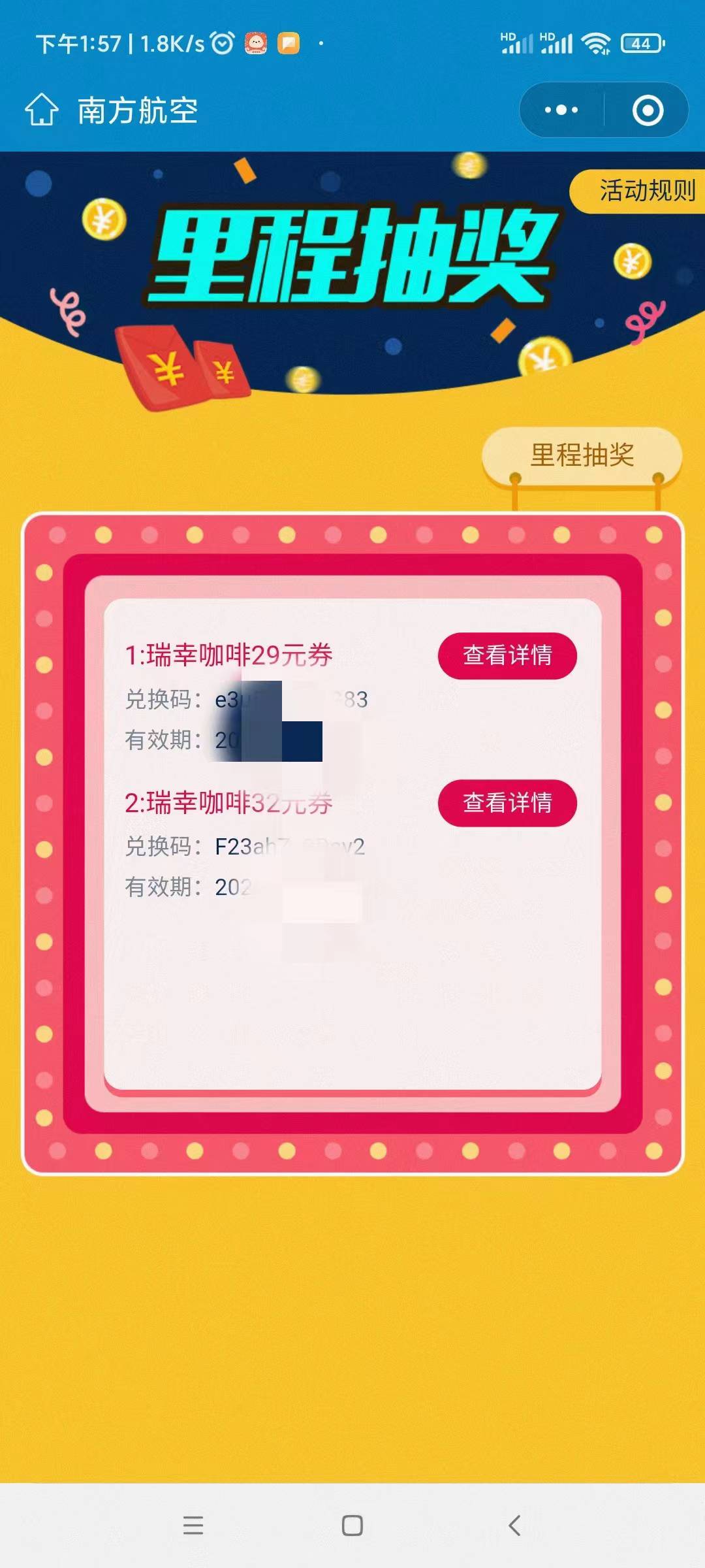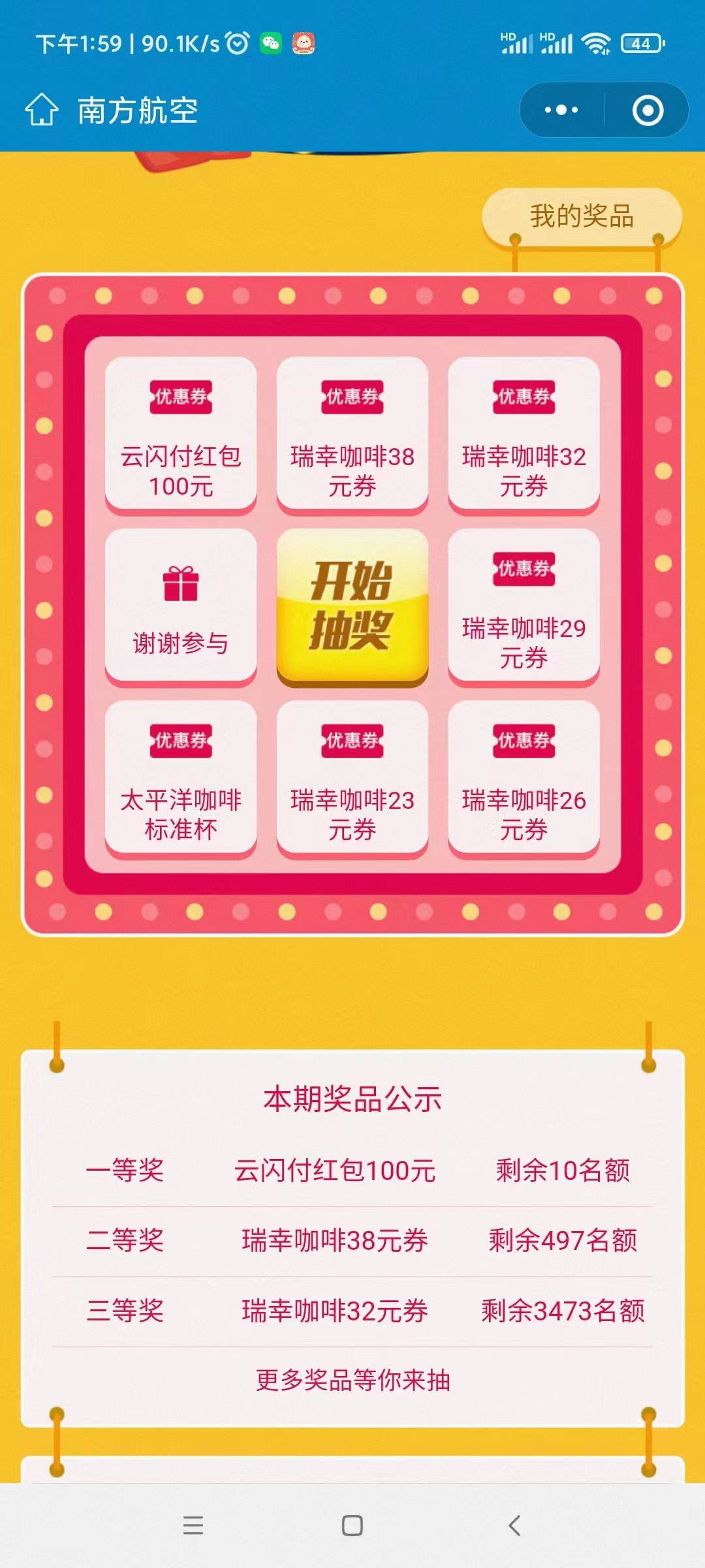南航小程序有里程的冲,我不知道哪来的里程抽了两次,好像必中,奖品数量估
