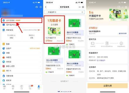 【支付宝279积分兑换1元猫超卡】新一期!支付宝APP->我的->支付宝会员->搜索“猫超卡”使用279积分兑换