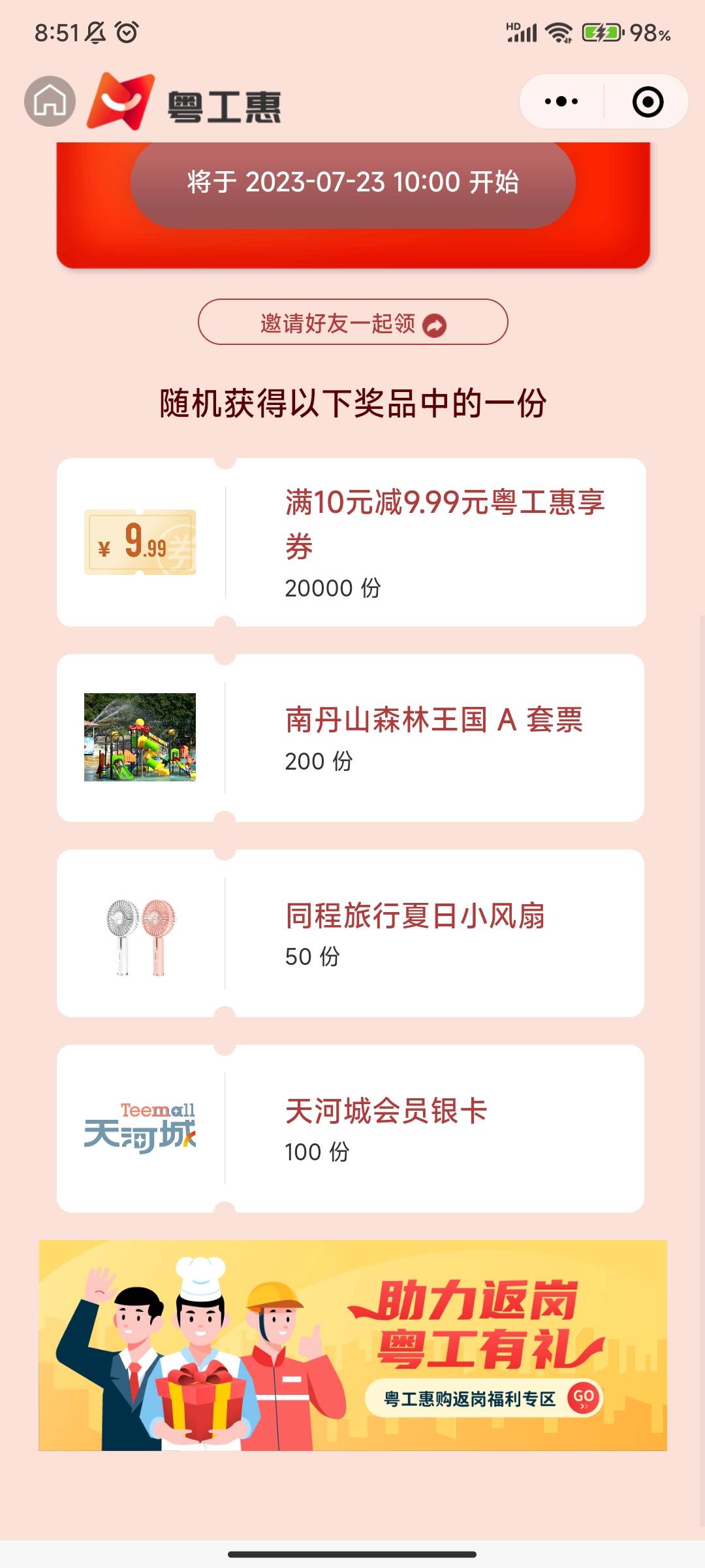 10点开始抽奖,粤工会实名认证会员!!! 一、活动主题:智送福利,粤工惠享 二、活动时间:7 月 23 日 10:00 - 7 月 27 日 22:00 三、活动对象:全省粤工惠实名认证会员 四、活动奖品: 1.满10元减9.99元粤工惠享券x20000份 2.南丹山森林王国 A 套票x200份 3.同程旅行夏日小风扇x50份 4.天河城会员银卡x100张 五、活动参与方式: 活动期间,会员可进入活动页面参与抽奖。活动将于7月28日上午10点开奖,中奖会员将在微信内收到中奖订阅消息。