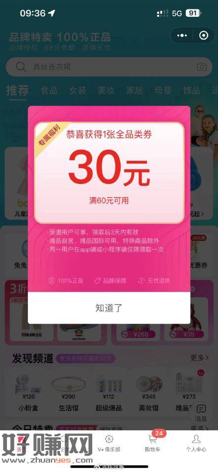 唯品会小程序,打开弹券