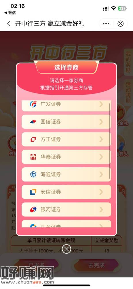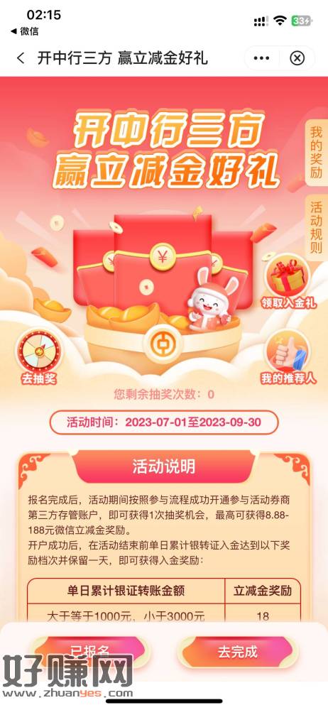中行大毛,找到图一的位置,不知道是不是广东才有,点报名然后你在这些证券开过户的绑上中国银行实体卡一类,四天之后就可以抽奖最低8.88,抽完在换预留手机号又可以抽一次