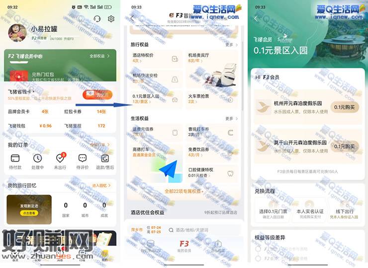 飞猪app-我的-顶部【飞猪会员中心】-F3/F4会员 下拉至【旅行权益】-【0.1元景区入园】