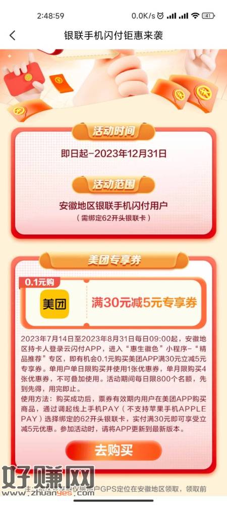 安徽云闪付0.1购30-5美团支付券,可以美团单车无损t ,一月4次,20润