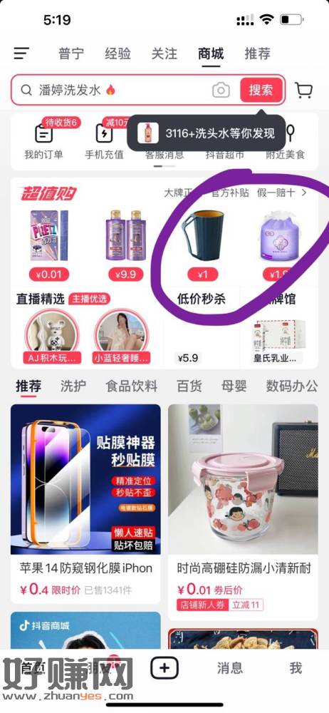 抖音搜低价秒杀领9-3卷,然后点商城图1位置,找1元的洗发水