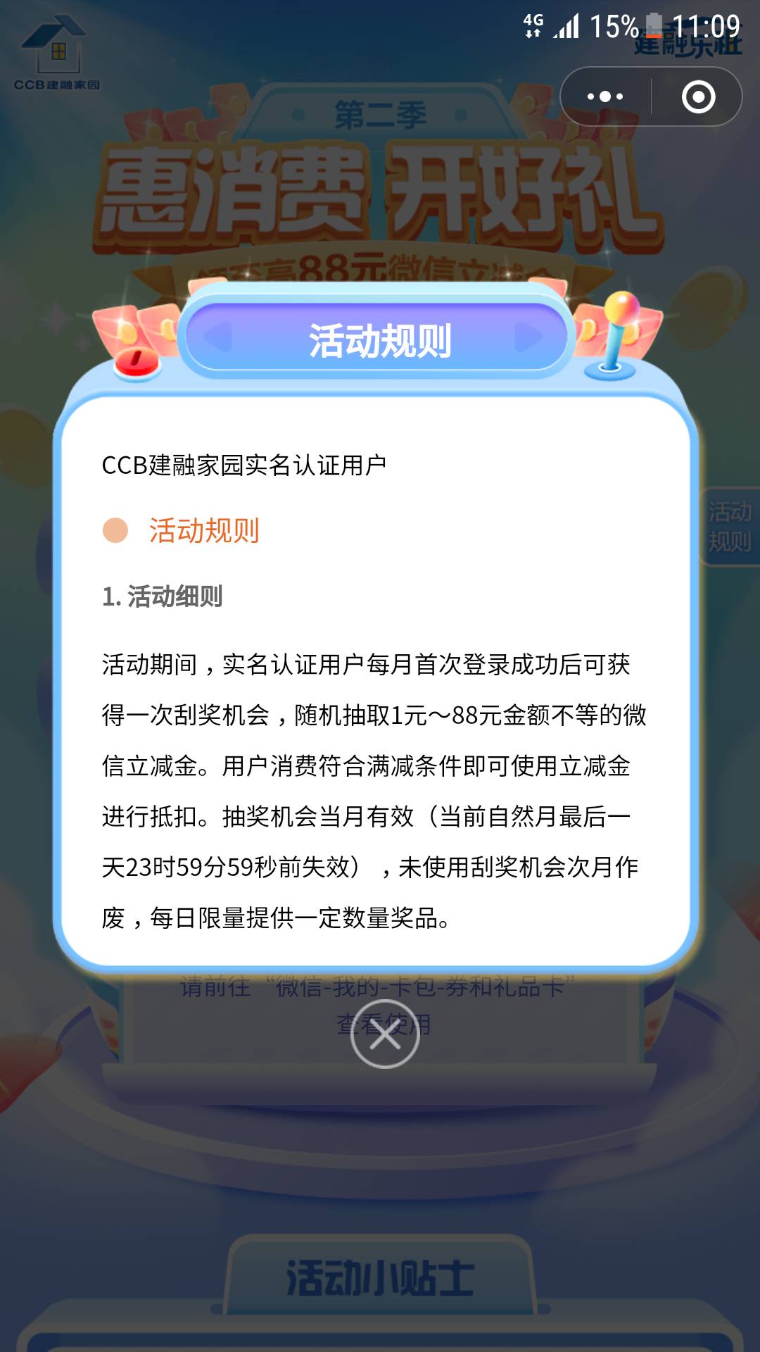 CCB建融家园:第二季惠消费活动正在进行中,至高88元微信立减金等您抽取,每天9点准时开抢,请前往“CCB建融家园”APP或小程序参与活动。