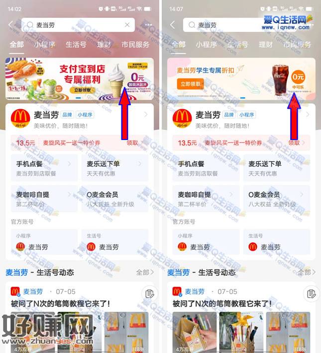 支付宝APP搜【麦当劳】-顶部滚动栏【0元甜筒】进入领取-返回滑动滚动栏【0元中可】领取