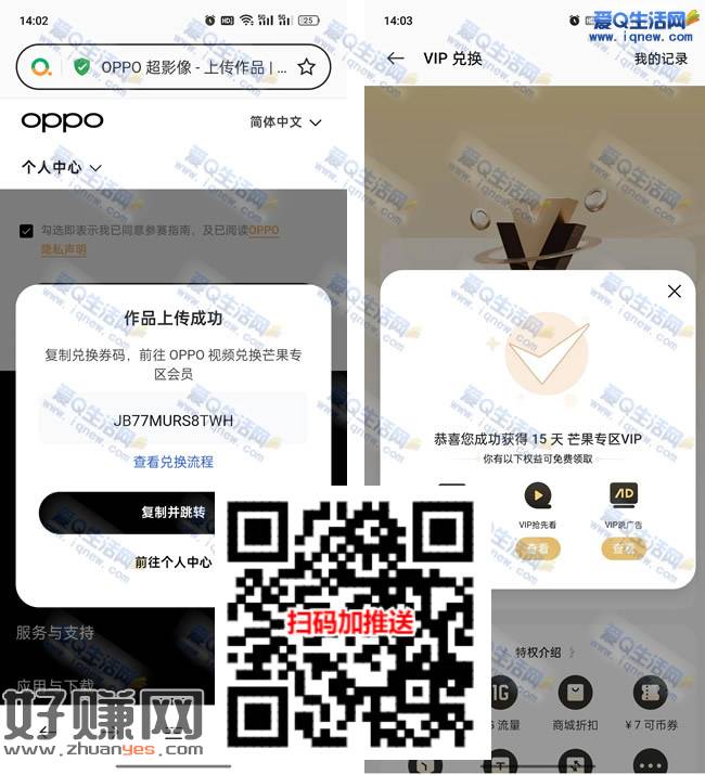 oppo旗下手机投稿必得芒果视频VIP会员 亲测15天秒到