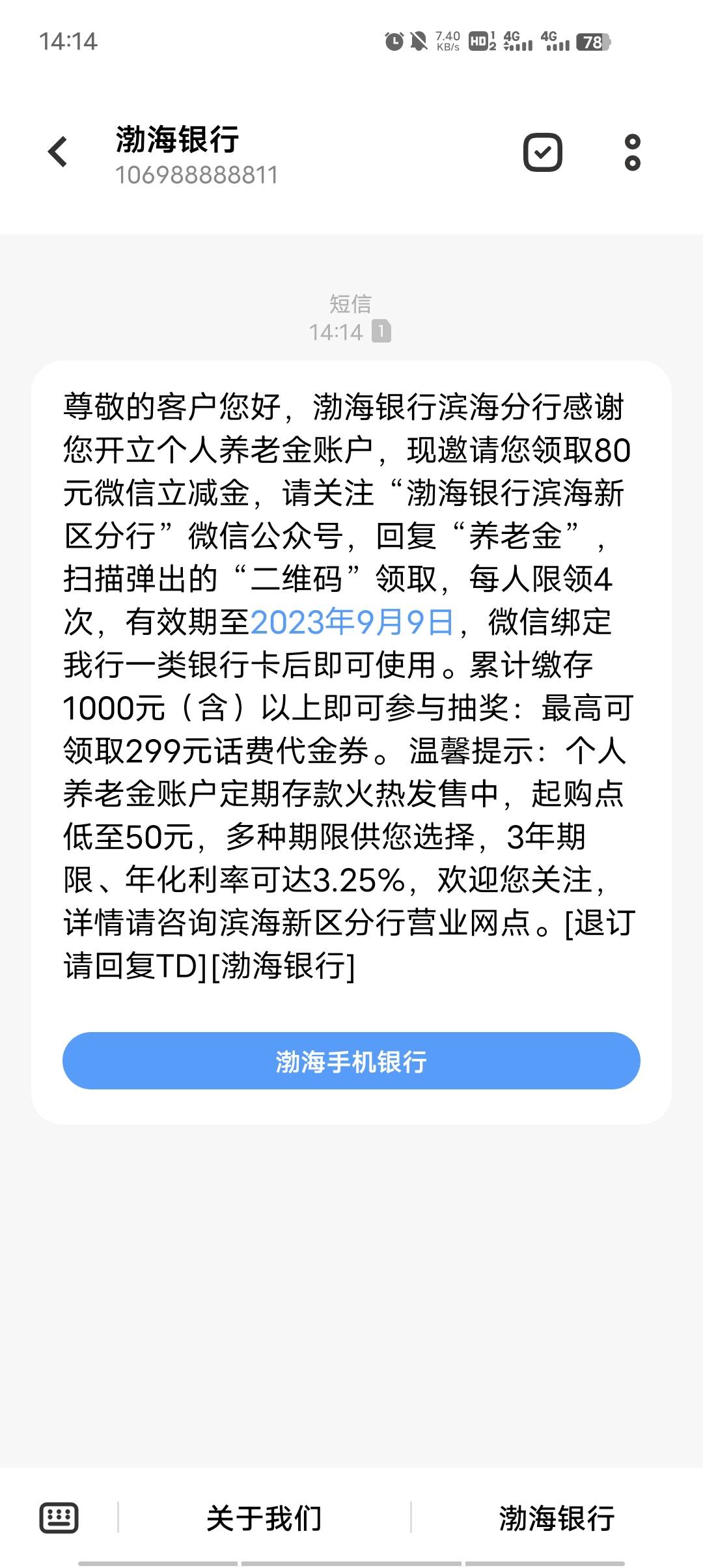 渤海养老金有短信的速度冲。80毛。 库存有限。能领4次20。 渤海养老金注销了我
