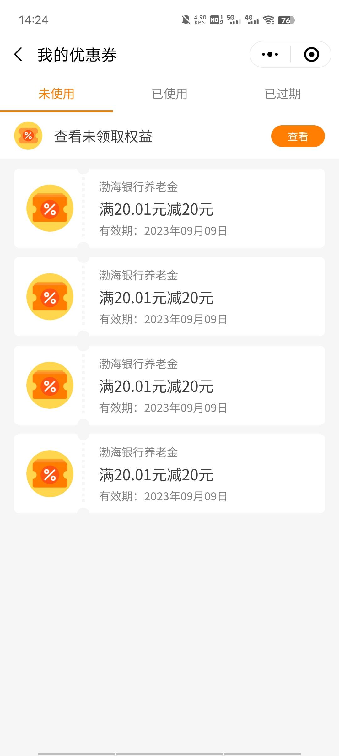 渤海养老金有短信的速度冲。80毛。 库存有限。能领4次20。 渤海养老