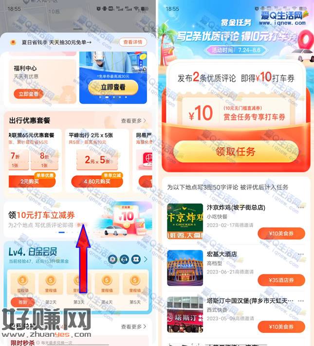 高德APP-打车-下拉中间滚动栏【领10元打车立减券】-领取任务去发布2条优质评论即可