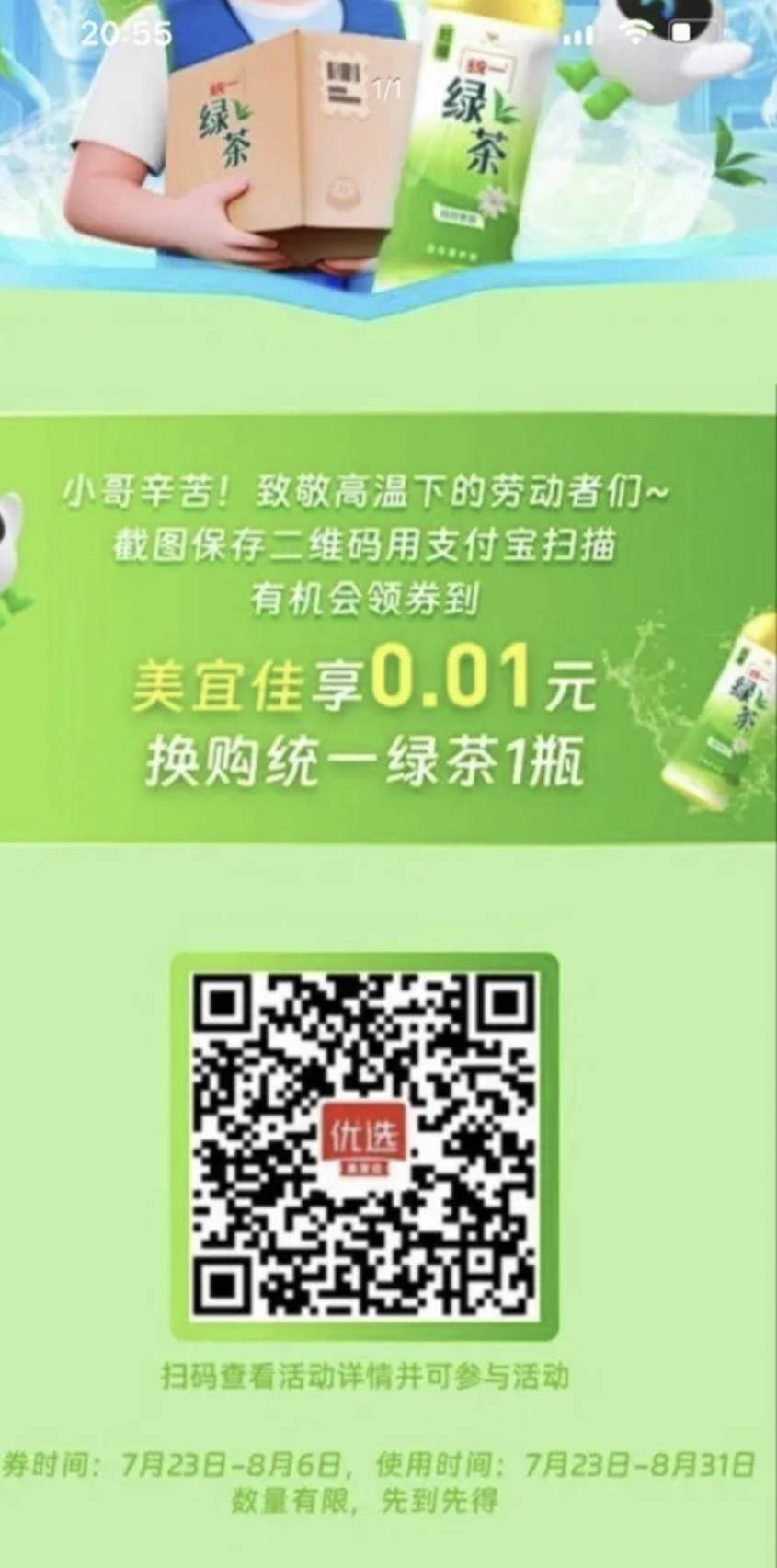 广东老哥看过来,特别是东莞美宜佳大本营! ZFB扫, 美宜佳0.01买统一绿茶, 一瓶500ml的。。。 领劵之后,看看附近有没有可用门店!!!实测一分买!!!
