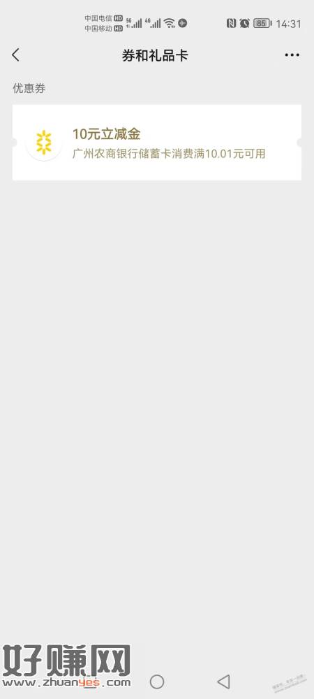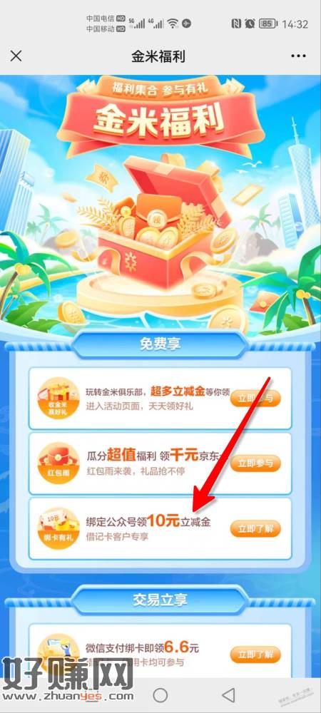 见截图,微公众号:广州农村商业银行…金米福利…绑定公众号领10元立减金