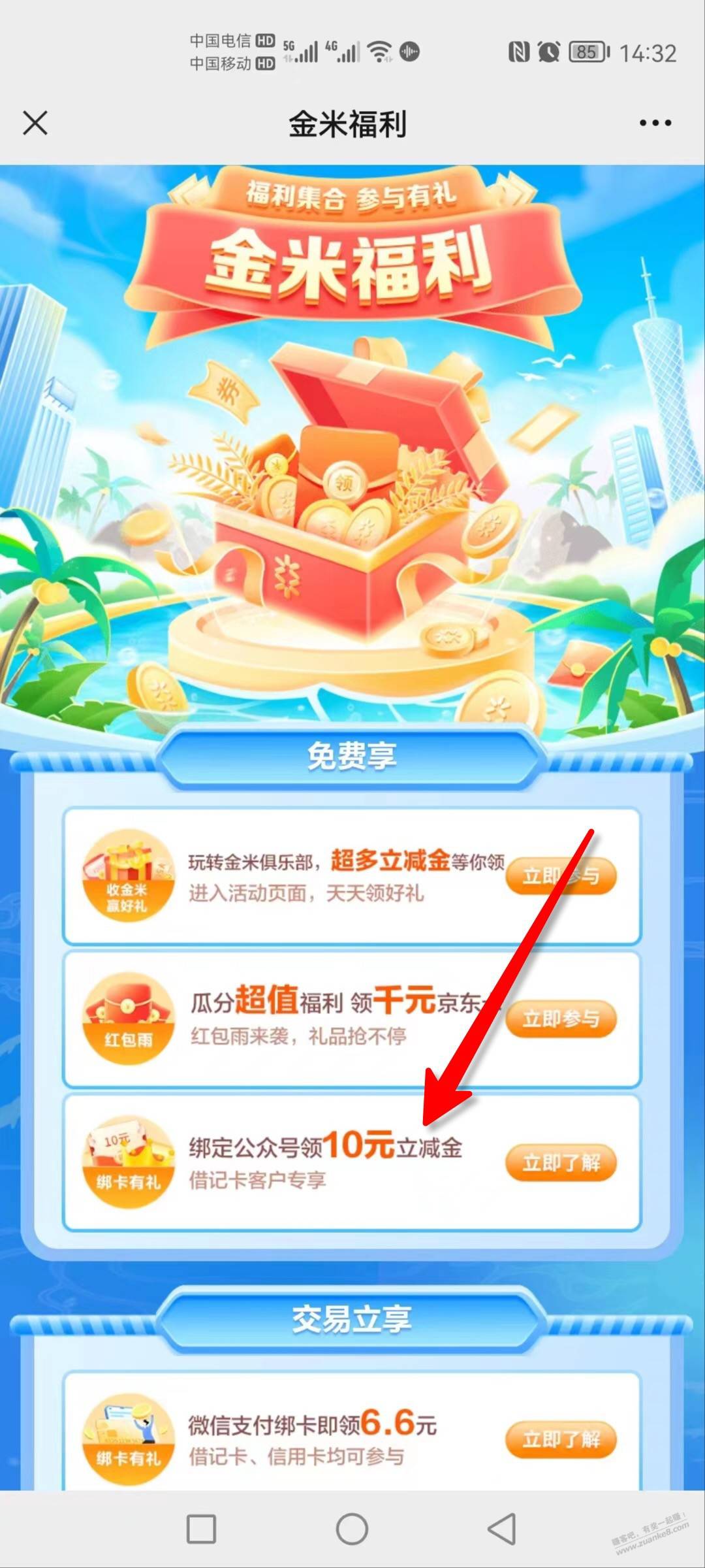 广州农商储蓄卡 大毛 10元 见截图,微公众号:广州农村商业银行…金米福利…绑定公众号领10元立减金 我之前领过的,今天又可以领一次