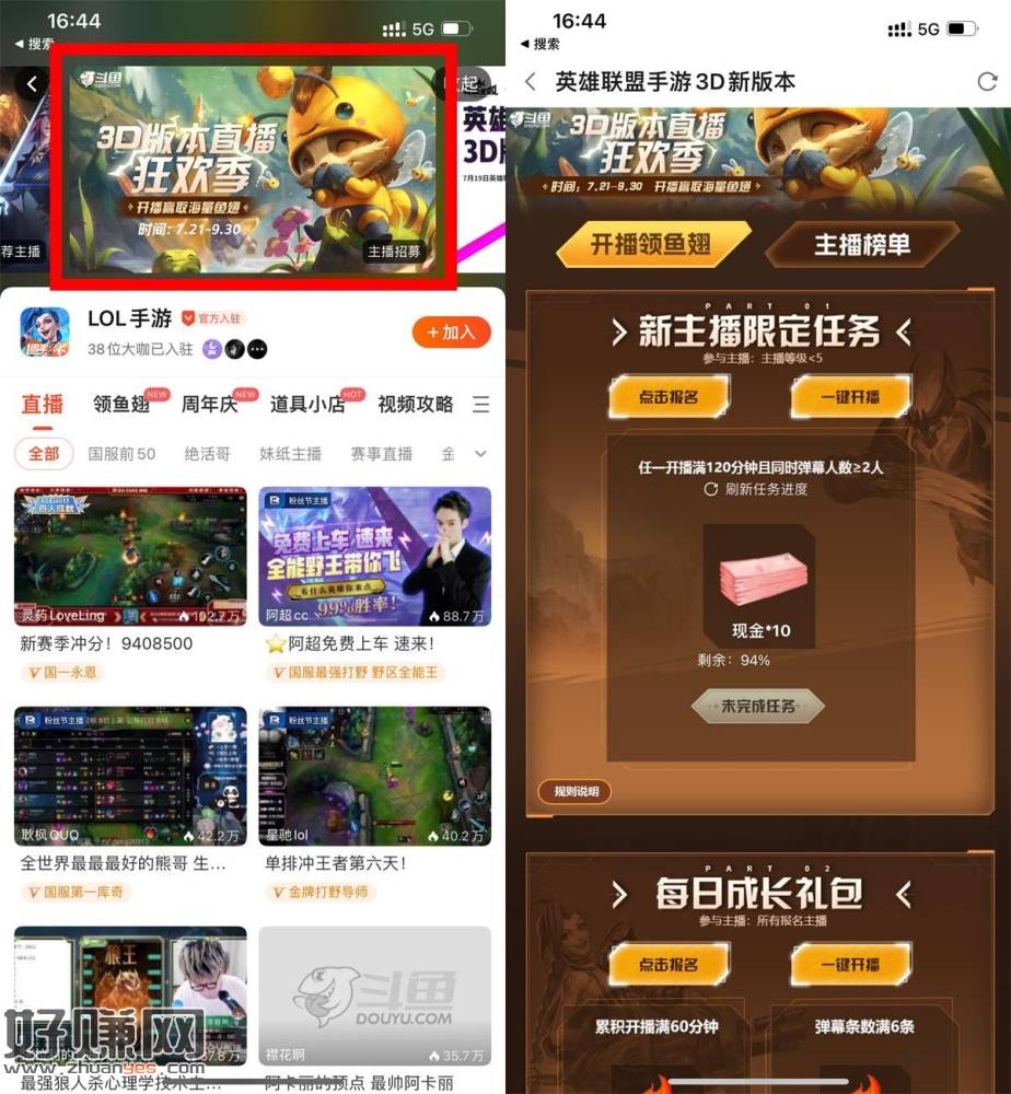 斗鱼APP搜索“LOL手游”->3D版本直播狂欢季->直播2小时领10元,下拉还有打卡1天领6元,有能力的上
