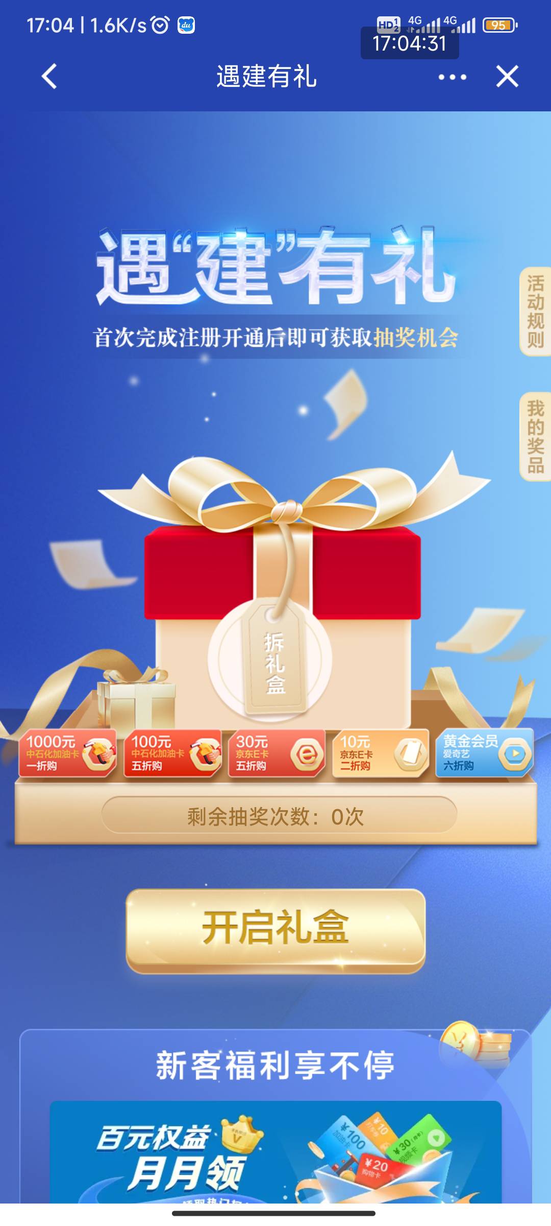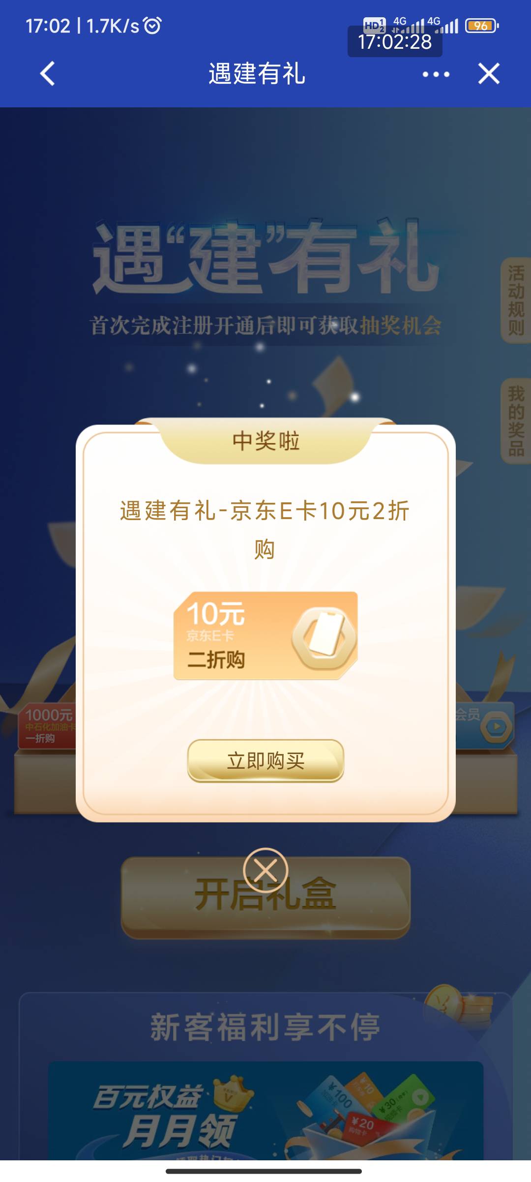 建设银行搜索遇建有礼,然后抽奖,我抽到两折买十元京东e卡