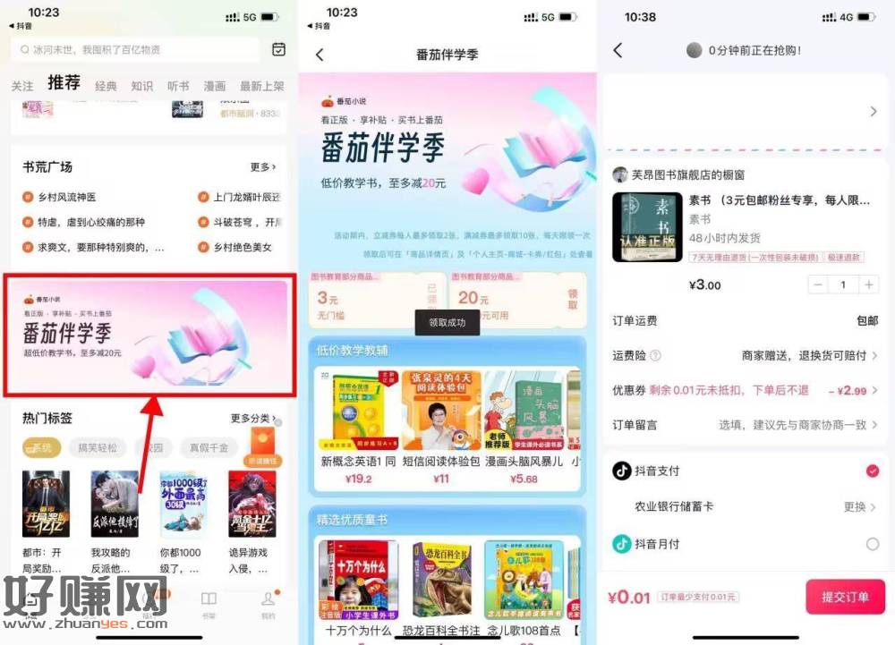 【番茄小说0.01元撸一本书包邮】新一期!番茄小说APP->首页下拉“番茄伴学季”->领取3元无门槛券->点“我的-商城”进入,搜索“包邮书”找到0.01元的包邮的书购买即可