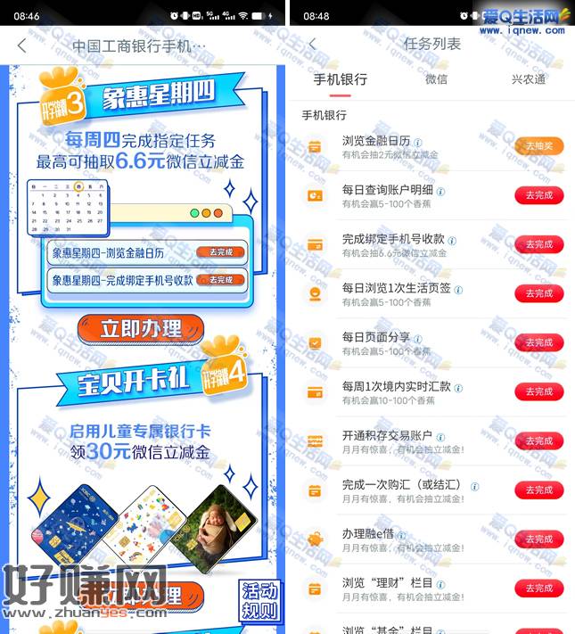 工行象惠星期四绑手机号+浏览日历抽6.6+2元微信立减金