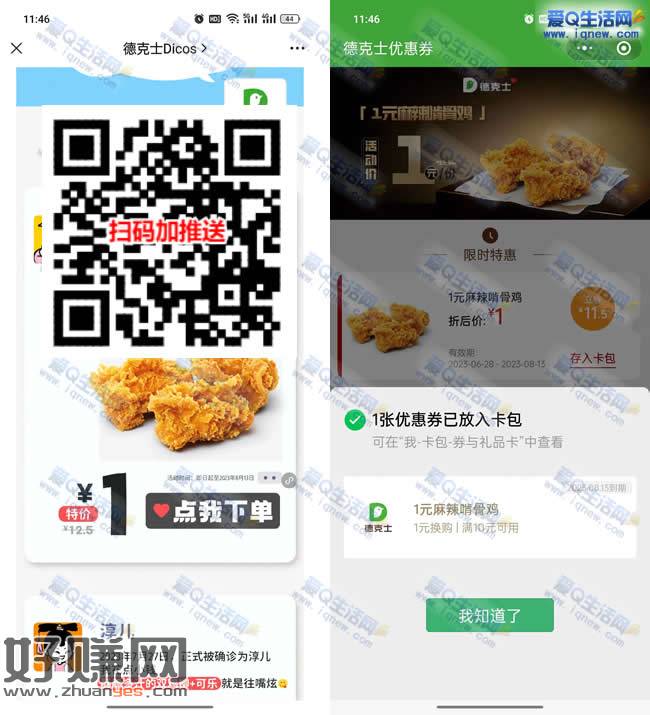免费领德克士1元麻辣啃骨鸡 满10元可叠加使用