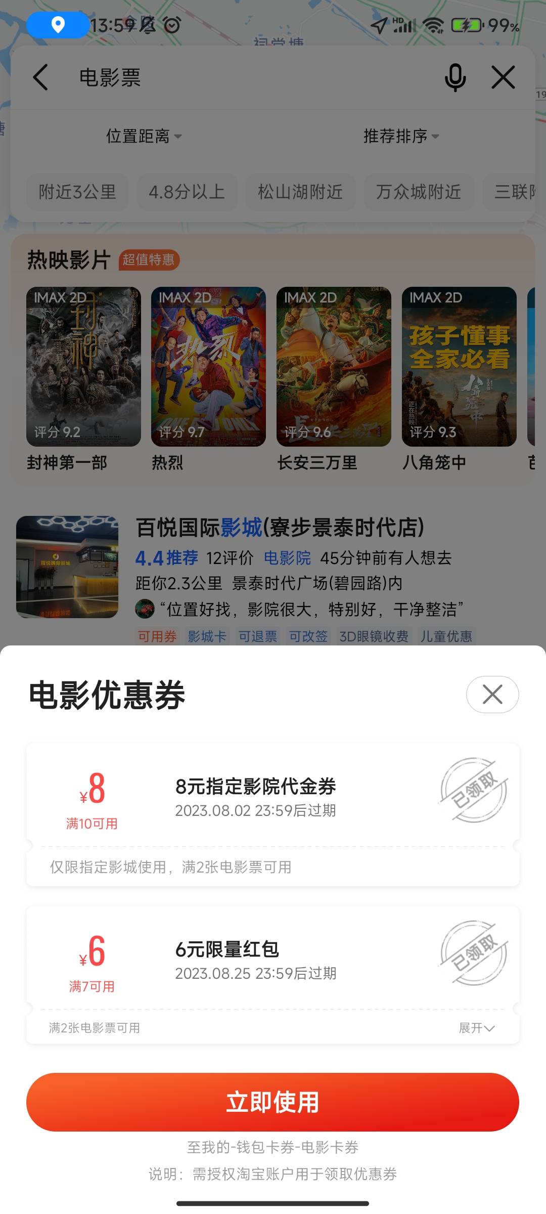 高德app搜索电影票,等待一下会有弹窗,8元和6元两张。然后去使用,写