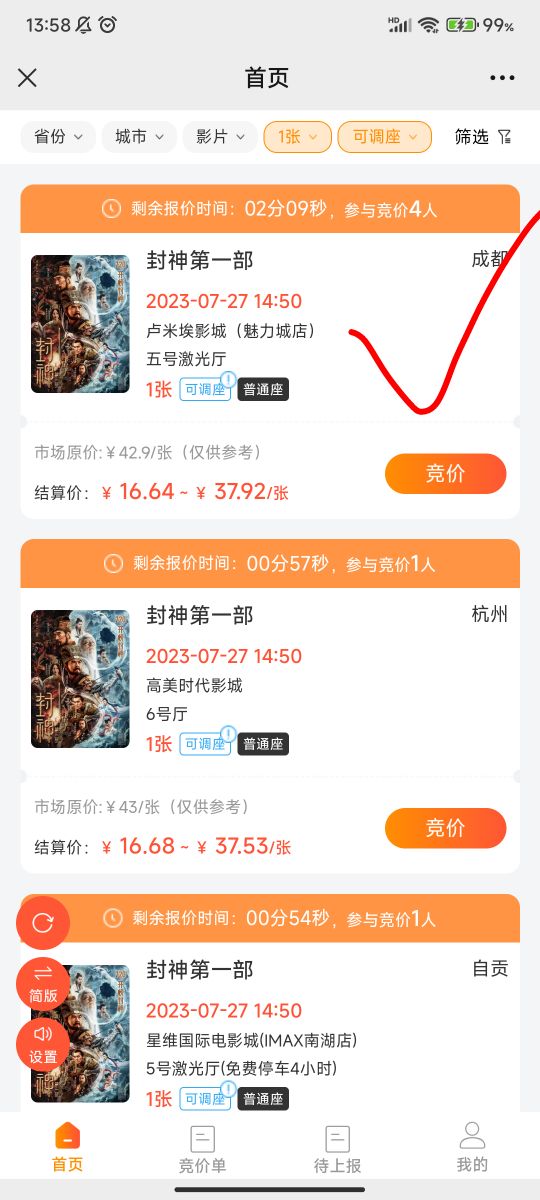 高德app搜索电影票,等待一下会有弹窗,8元和6元两张。然后去使用,写着两张才可以下单,尝试下单一张也可以用的!!! 买一张就能-8!!! 利润大概是5到6左右。。。 但是,有个前提,你要有本钱!!!嫌麻烦的,没本钱的老哥可以忽略!!! 渠道属于淘票票!!!海鲜市场出,也行!!!各种渠道出!!!现在电影优惠基本完结!!!比较好出手!!!