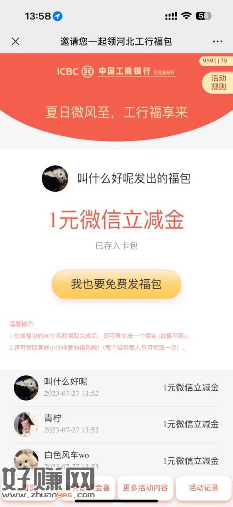 定位河北,工行立减金 限卡每天领2张 一个v可领5张 可多v ,这个月快结束了没玩的赶紧玩,争取毕业
