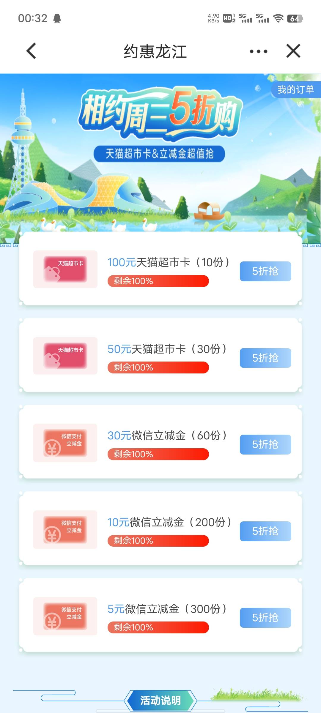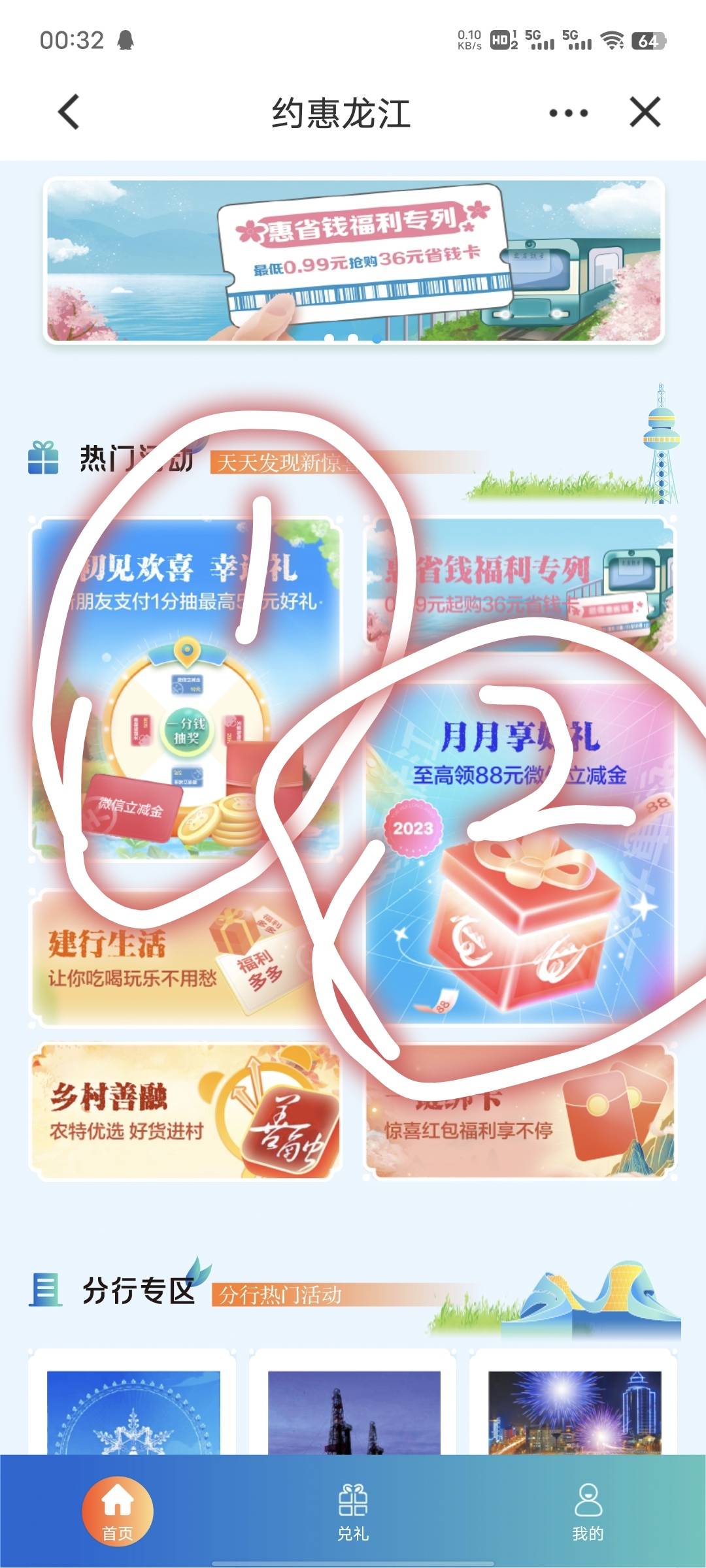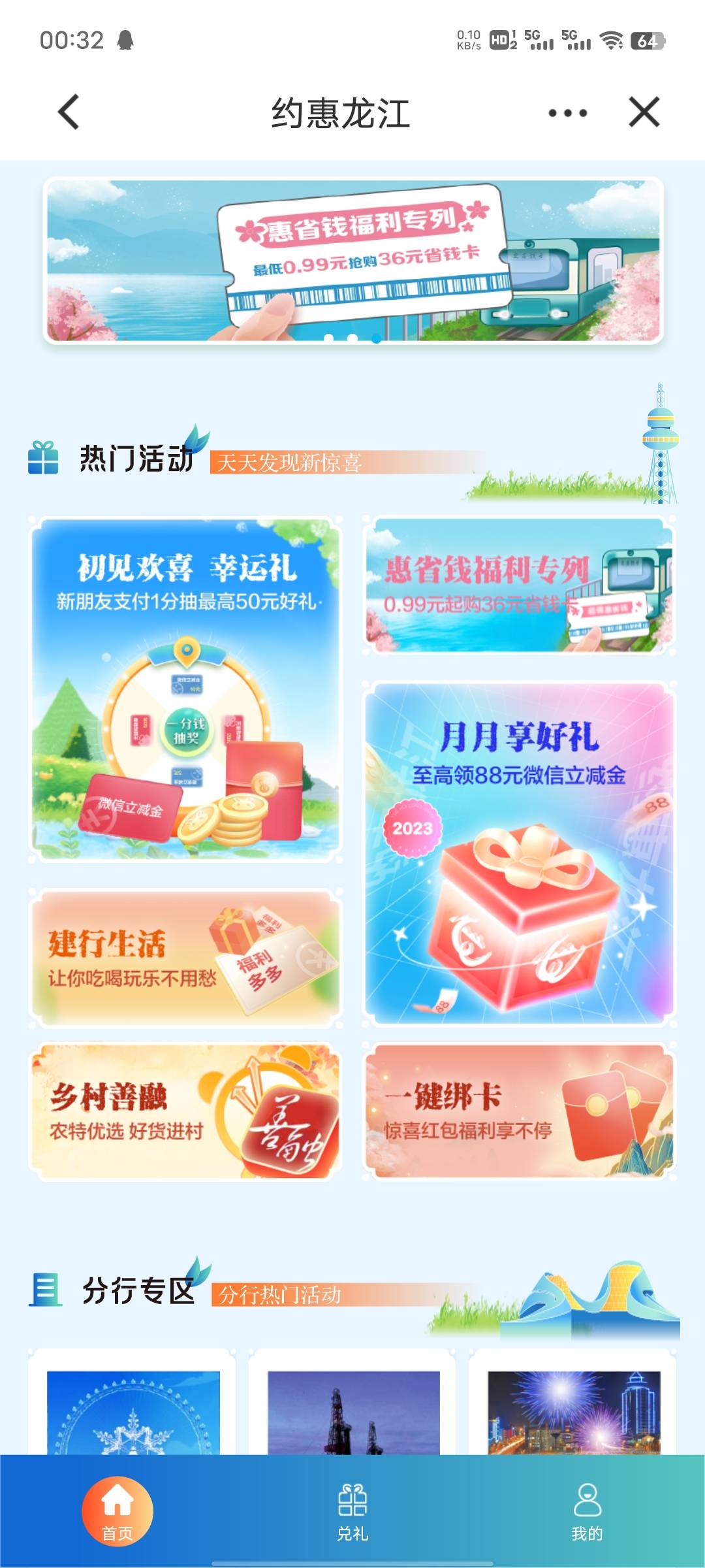 建行黑龙江,1.新客抽奖,2.月月能领,周三5折购,还有玉兔币换立减金,玉兔币没活动不好弄,每天签到才给5个,想冲的可以冲