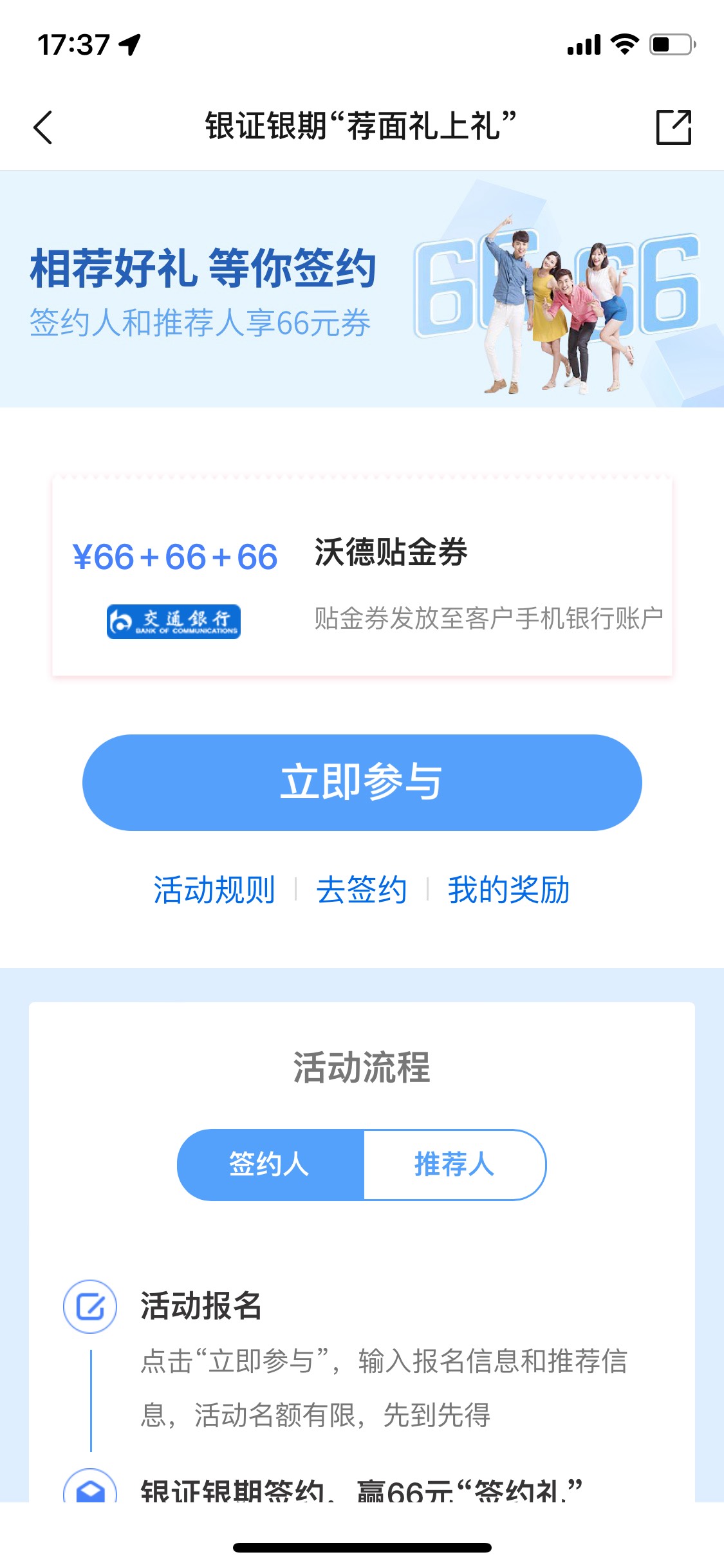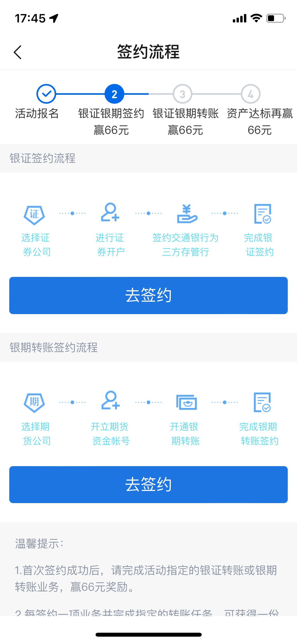 老哥们申请完广东中行第三方存管的 换绑交通银行申请66毛了 交通必须一类卡 搜银证签约有礼 先报名 然后去换绑吧 签约拿66 入金1000 还有66