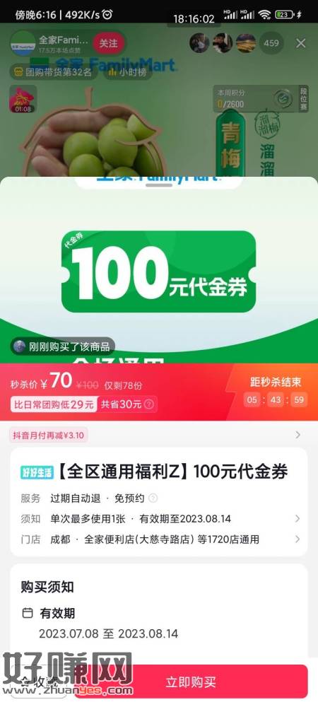 单抖音号润5*8 dy搜索全家直播间,70购100代金券 一号限买5张(抢光的话可以等等,基本一会就重新放货)然后78卖视权益(抖音过期自动退款 不会亏本)