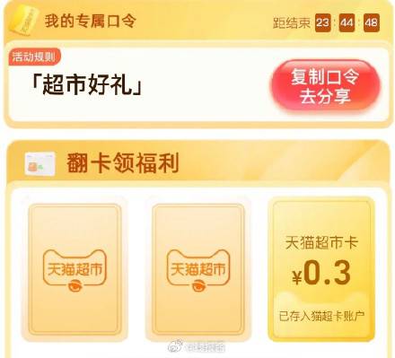 天猫超市-首页右下方悬浮图标“惊喜口令”-输入口令“超市好礼 ”进入翻牌可领随机猫超卡