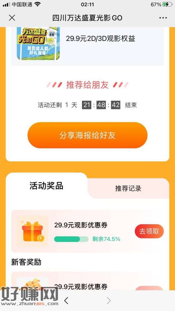 邀请3个人助力,我的满了,邀请多了没用,只能3人,领取万达29.9电影卷可以兑换2D3D电影,我看到任务台子是2元收,