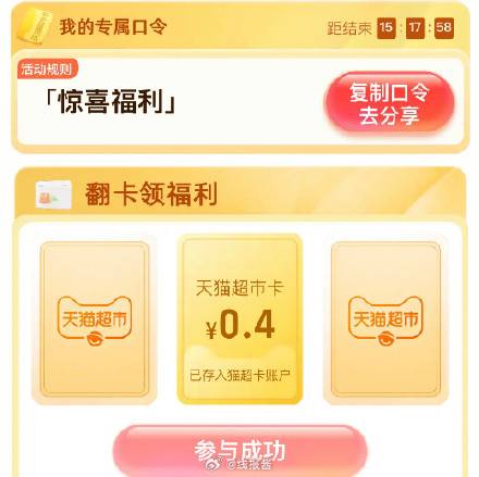 天猫超市-首页右下方悬浮图标“惊喜口令”-输入口令“惊喜福利 ”进入翻牌可领随机猫超卡