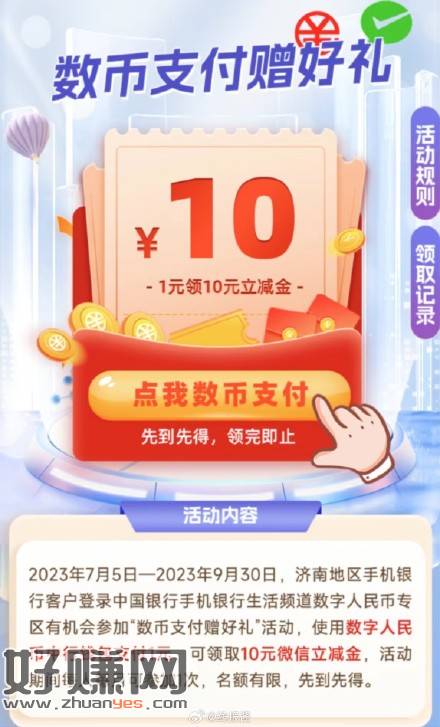 2023年7月5日一2023年9月30日,济南地区手机银行客户登录中国银行手机银行生活频道数字人民币专区有机会参加“数币支付赠好礼”活动,使用数字人民币中行钱包支付1元,可领取10元微信立减金,活动期间每人每月可参加1次,名额有限,先到先得。