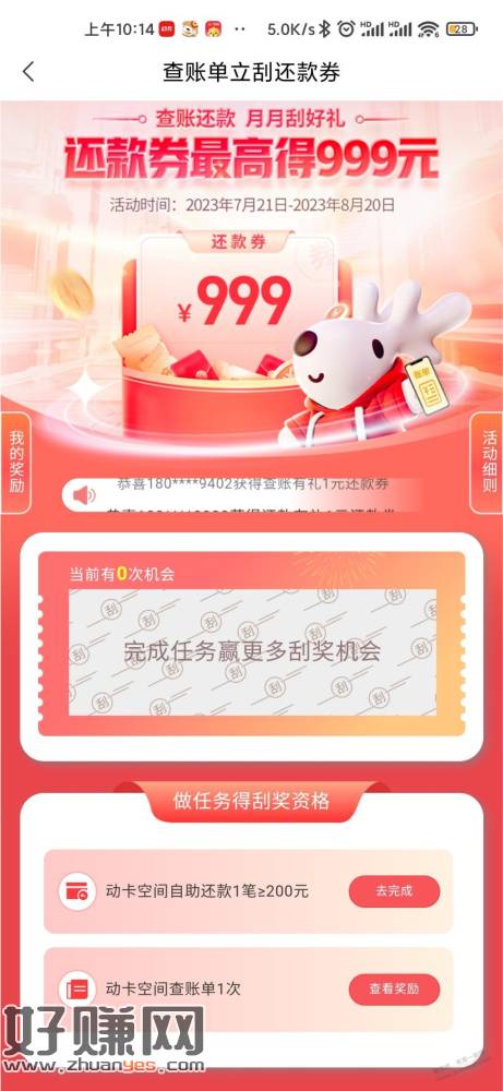 点账单,下边滚动栏查账单抽奖,每个月两次机会,刚中了1元还款券