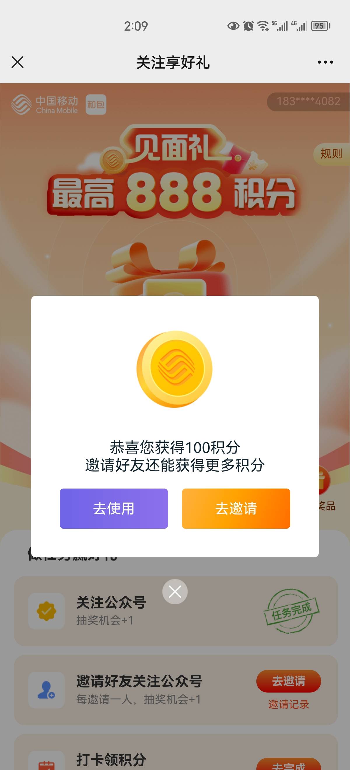 取消关注中国移动和包公众号,再关注,推文抽奖 我中100