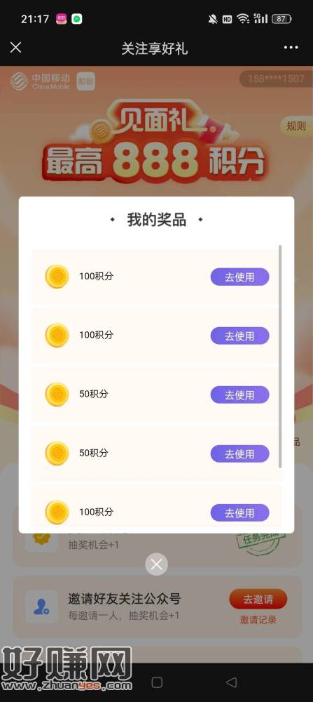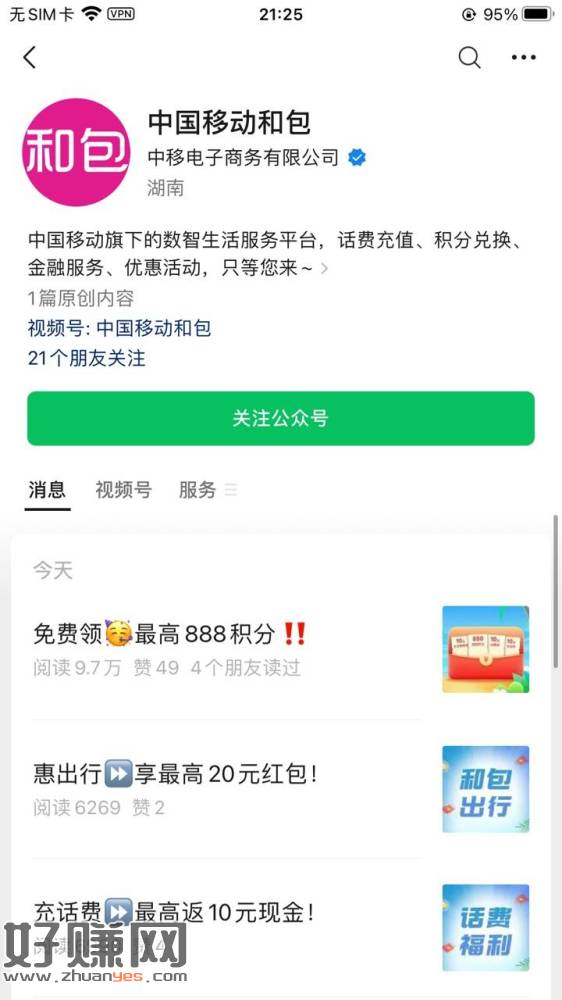 取消关注中国移动和包公众号,再关注,推文抽奖 刚拿600积分,需要的拿哈
