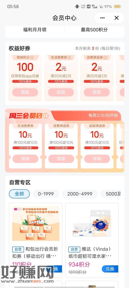 和包APP 星期三 会员中心 权益好券 100积分(图五)