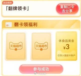 天猫超市-首页右下方悬浮图标“惊喜口令”-输入口令“翻牌领卡”进入翻牌可领随机猫超卡