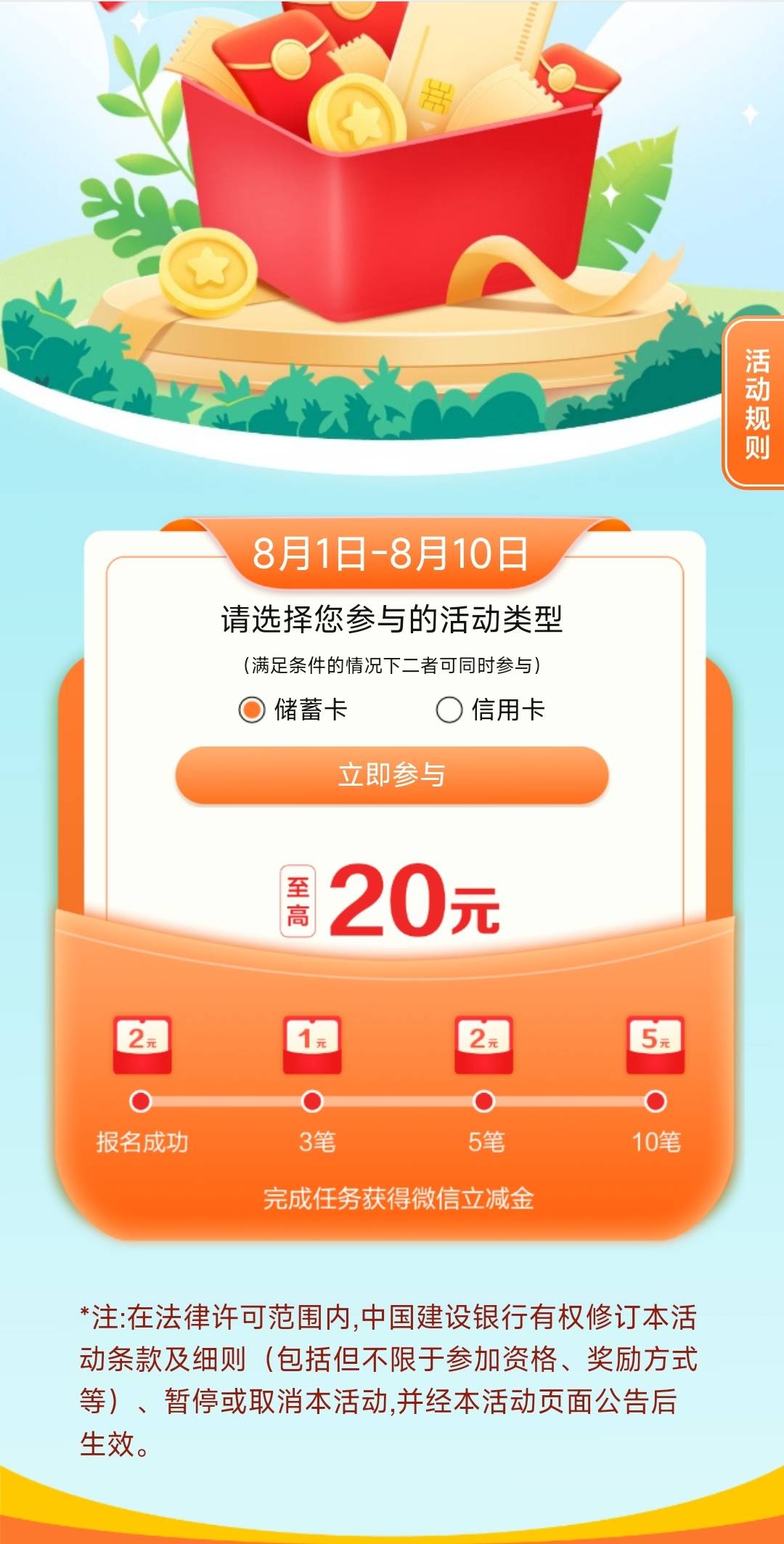 建设银行月月刷最高20元立减金202308期 有信用卡就20,没有就
