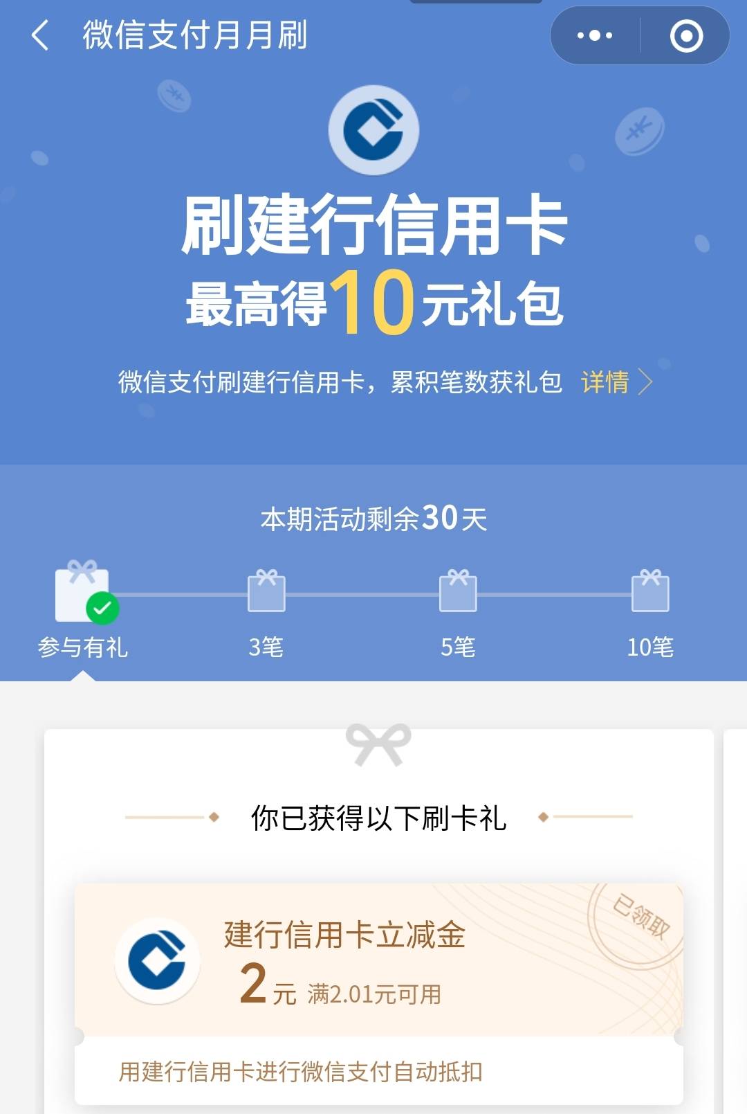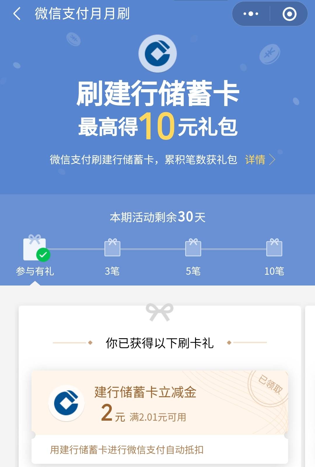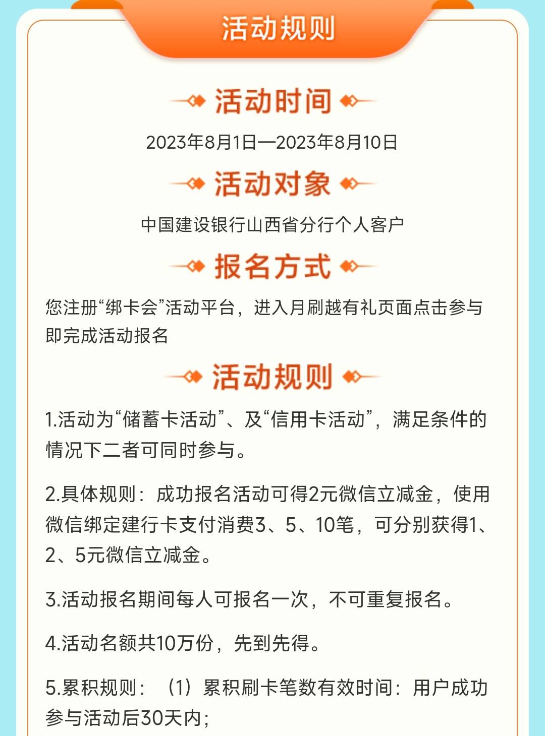 建设银行月月刷最高20元立减金202308期 有信用卡就20,没有就10块 微信绑定建行信用卡储蓄卡参与活动 需开通建行山西电子户,等待4天后获取月刷月有礼资格! 立减金10万份(100万活动经费),先到先得! 微信扫码如下图所示参与