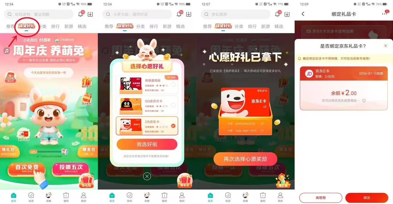 小米游戏中心萌兔好礼领2元京东卡、QQ超级会员月卡 亲测秒到: