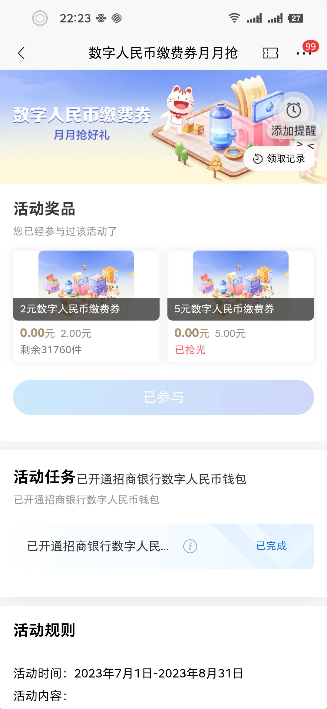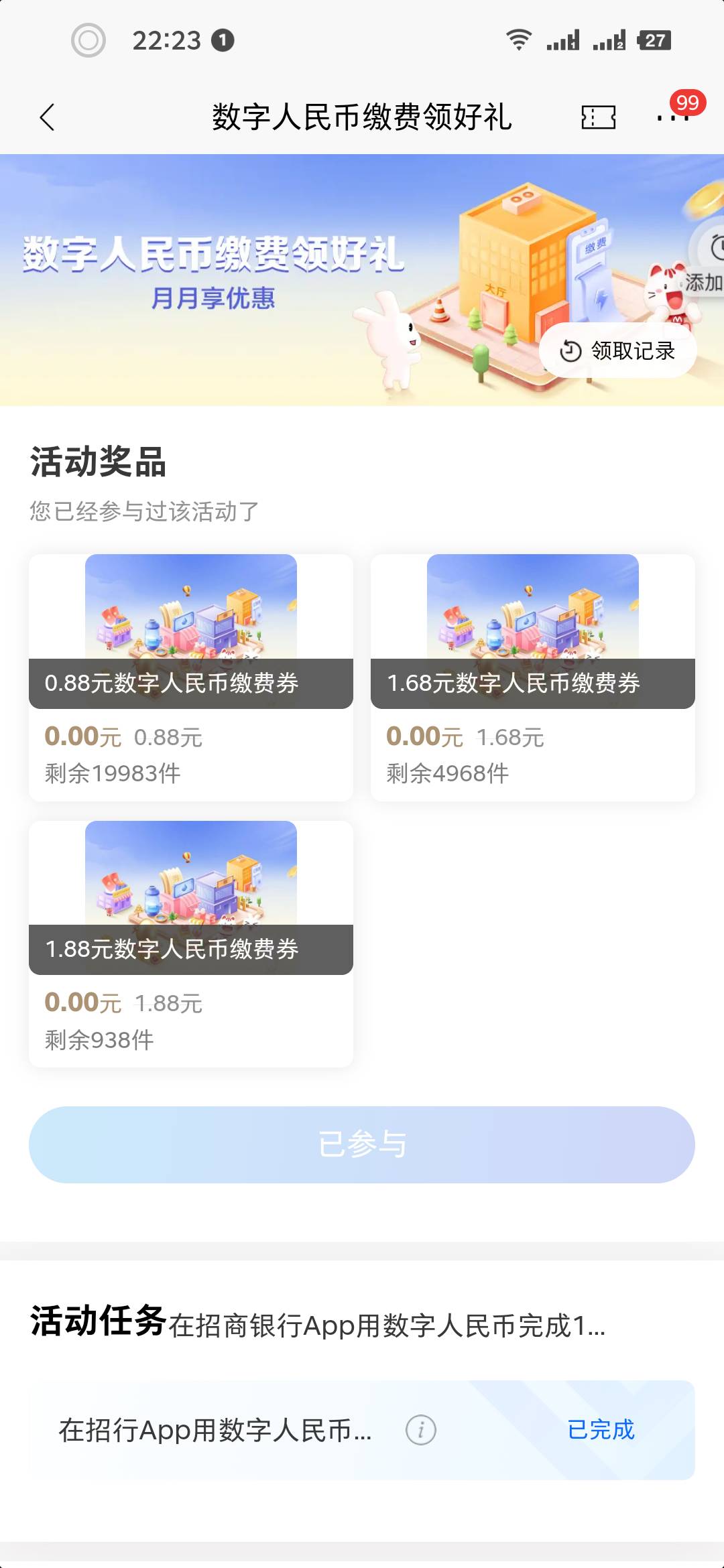 招行两张数币缴费券,首页搜数字人民币活动,好像只能在招行缴话费用,其它自测