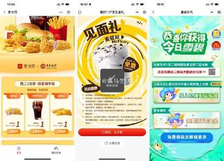 中国银行APP搜索“麦当劳”->1元买菠萝派/香芋派/中杯可乐,可直接核销下单——麦当劳APP奖励计划20积分抽脆汁鸡/甜筒/麦旋风,再叠加使用墨迹天气和可口可乐的免费雪碧券——墨迹天气小程序->点击顶部横幅进入->每天免费领取麦当劳雪碧1杯