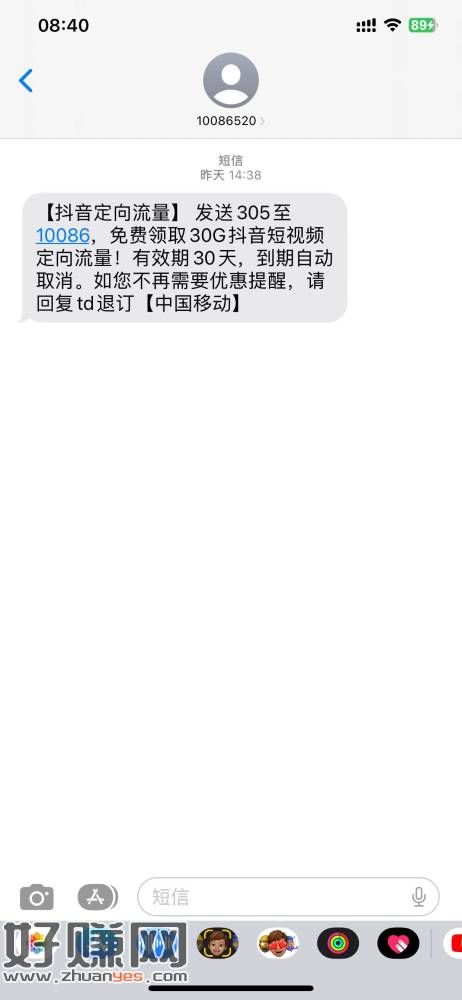 【抖音定向流量】 发送305至10086,免费领取30G抖音短视频定向流量!有效期30天,到期自动取消。如您不再需要优惠提醒,请回复td退订【中国移动】