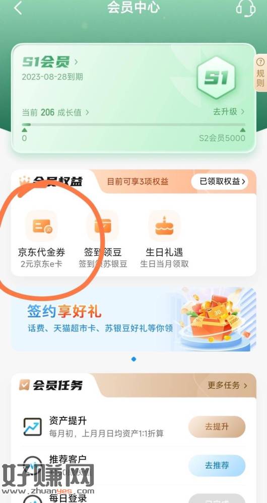 江苏银行APP,我的,最上面S会员,进入直接领2元京东E卡。