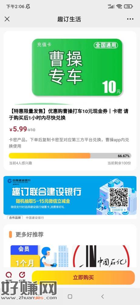 月初优惠,限量100份,5.99元购曹操10元打车券,小程序