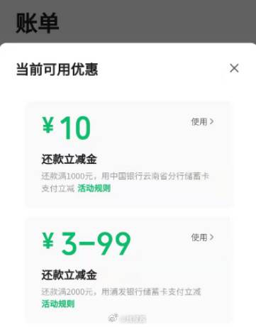 云南中行储蓄卡微信还款1000-10,浦发2000-3+