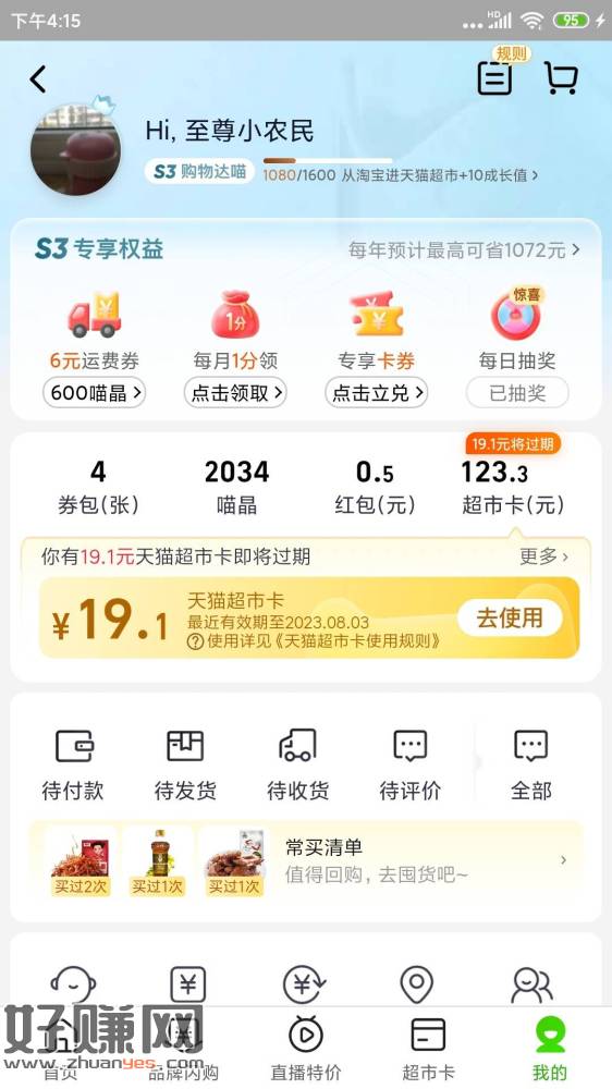 天猫如图左上昵称下面s3购物几个字图标那里点进去查看,底部弹