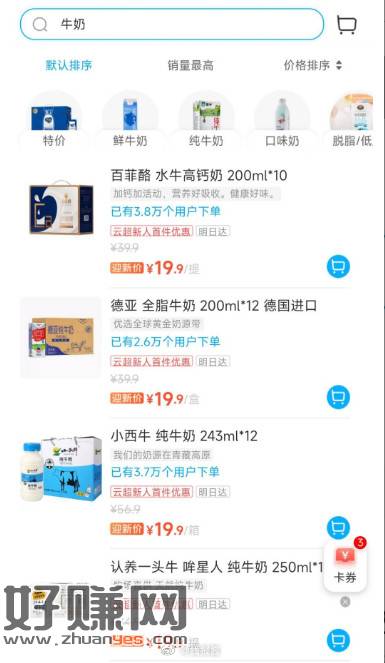 支付宝搜盒马,新户有多款牛奶特价