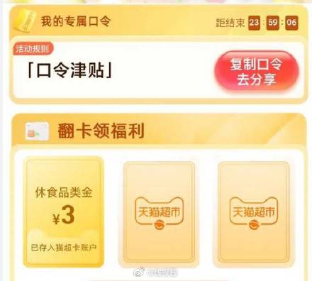天猫超市-首页右下方悬浮图标“惊喜口令”-输入口令“口令津贴”进入翻牌可领随机猫超卡