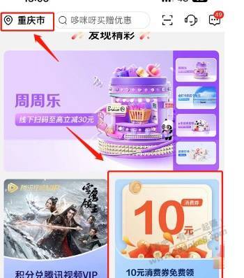 工银e生活APP,改定位重庆,下拉,领取“10元消费券免费领”